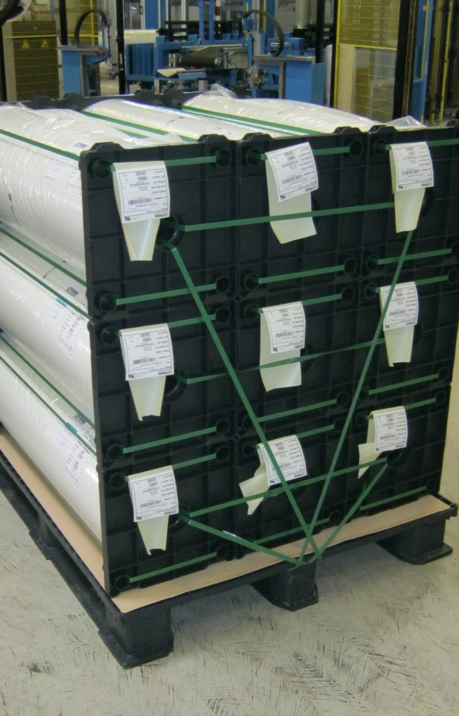 The system works using two disposable flanges (“a perdere”), allowing rolls to be safely suspended, strapped, and palletized without traditional cores or shafts.