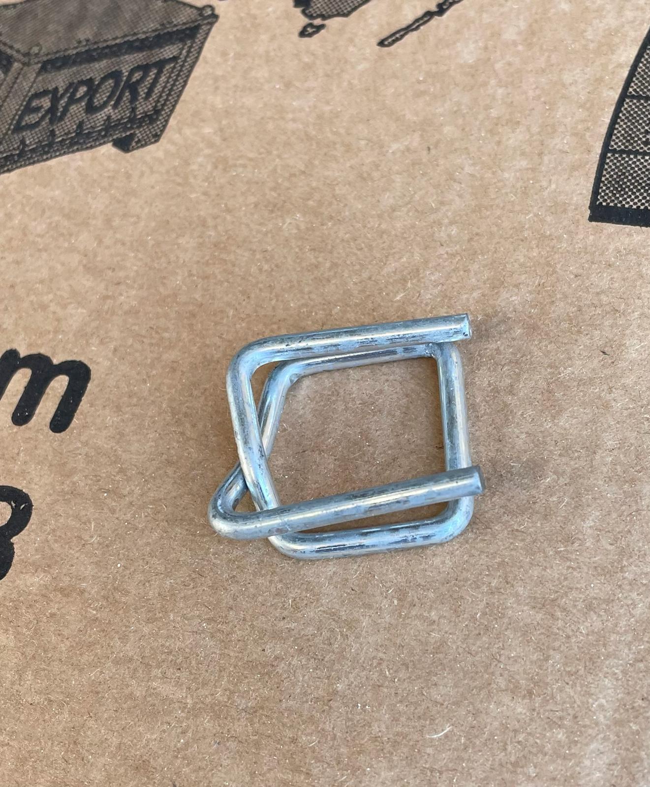 The 19 mm galvanized wire buckle is designed for secure fastening of composite and textile strapping used in industrial packaging and load securing.