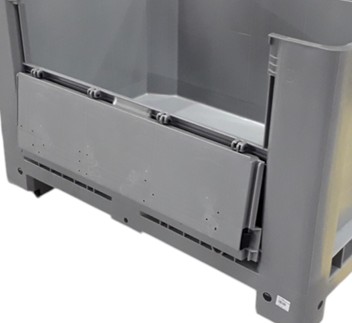 Durable HDPE plastic front door designed for 800×1200 mm bulk containers, approximately 800 mm high. Provides easy access for loading and unloading while maintaining container strength and stability.