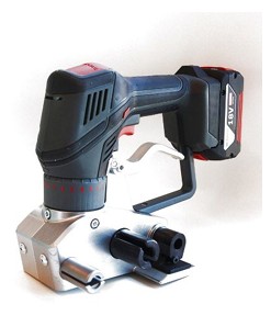 Professional battery-powered tensioner for composite and textile straps from 19 to 32 mm, featuring 10 adjustable tension levels, ergonomic single-handed operation, and a balanced grip.