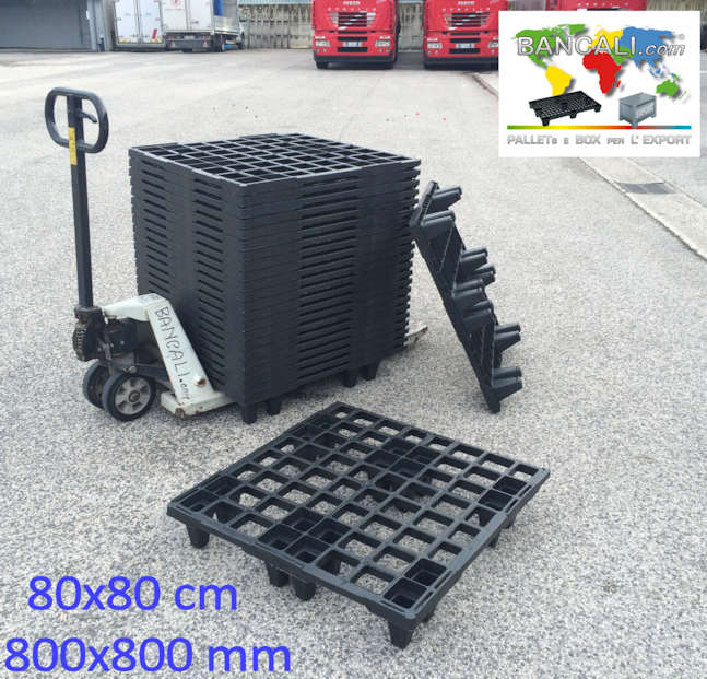 Lightweight export plastic pallet measuring 800×800 mm, featuring a square grid mesh and nestable design for efficient stacking and reduced transport volume.