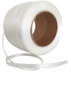 High-strength composite polyester strapping, 19 mm wide, ideal for securing heavy loads during transport and storage. Supplied in a 500-meter roll. Tare weight: 9 kg. Durable, lightweight, and safe for industrial palletizing applications.